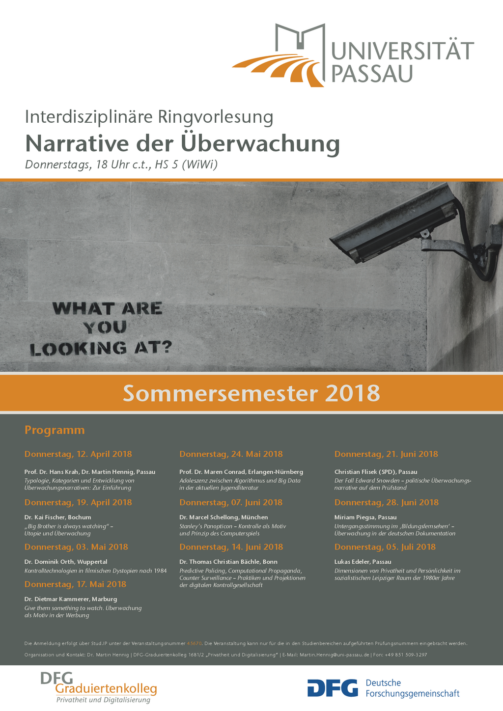 Von Benthams Panopticon, über Orwells 1984 und Eggers The Circle bis hin zur Weltraumtheorie des BND: Nicht erst seit den Enthüllungen Edward Snowdens gibt es eine Vielzahl von Motiven und Erzählungen der Überwachung, die kulturelle Verhandlungen und Vorstellungen von Sicherheit und Freiheit prägen. In einer Ringvorlesung legen GastwissenschaftlerInnen aus dem Bereich der Kultur-, Medien und Sozialwissenschaften Grundzüge dieser Narrative dar.